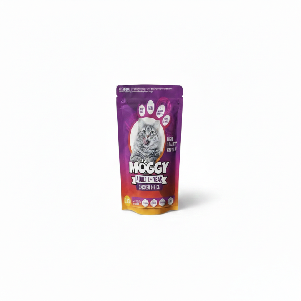 Moggy Adult Cat Food transforms every meal into a moment of pure enjoyment. Crafted to satisfy the sophisticated palate of adult felines, this Chicken and Rice blend offers a comforting taste that makes mealtime the most anticipated part of your cat’s day.